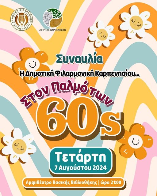 Η Δημοτική Φιλαρμονική Καρπενησίου έρχεται να γεμίσει το Αμφιθέατρο της Βασικής Βιβλιοθήκης με μουσική εμπνευσμένη από τη δεκαετία του ’60! Η μουσική του ’60, επηρεασμένη από τη jazz και τη blues της προηγούμενης δεκαετίας, το rock n roll και την κουλτούρα των χίπις μας μεταφέρει χρώματα και μηνύματα ρομαντισμού, διασκέδασης, ειρήνης και αγάπης.