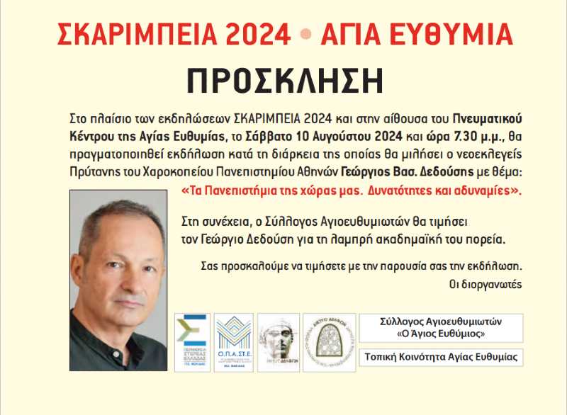 Στο πλαίσιο των εκδηλώσεων ΣΚΑΡΙΜΠΕΙΑ 2024 και στην αίθουσα του Πνευματικού Κέντρου της Αγίας Ευθυμίας, το Σάββατο 10 Αυγούστου 2024 και ώρα 7.30 μ.μ., θα πραγματοποιηθεί εκδήλωση κατά τη διάρκεια της οποίας θα μιλήσει ο νεοεκλεγείς Πρύτανης του Χαροκοπείου Πανεπιστημίου Αθηνών Γεώργιος Βασ. Δεδούσης με θέμα:
