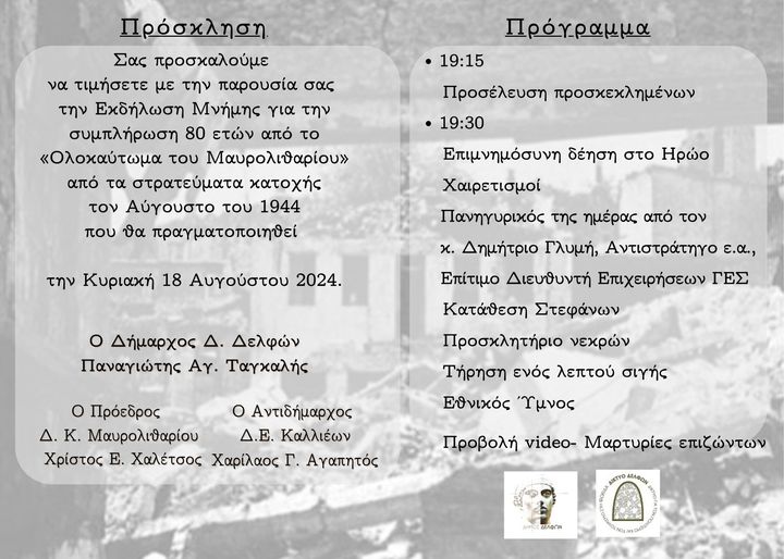 Ο Δήμος Δελφών, η Δημοτική Ενότητα Καλλιέων και η Δημοτική Κοινότητα Μαυρολιθαρίου σας προσκαλούν στην Εκδήλωση Μνήμης για την συμπλήρωση 80 ετών από το «Ολοκαύτωμα του Μαυρολιθαρίου» από τα στρατεύματα κατοχής τον Αύγουστο του 1944, η οποία θα πραγματοποιηθεί την Κυριακή 18 Αυγούστου 2024.