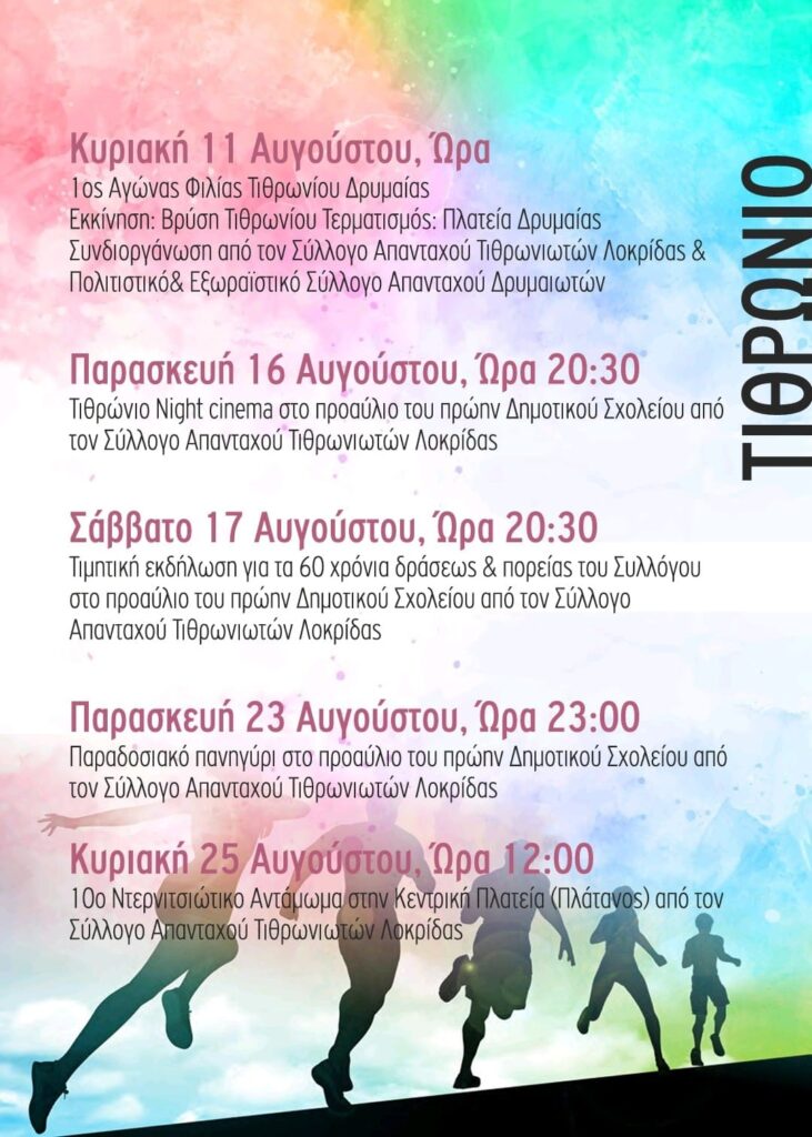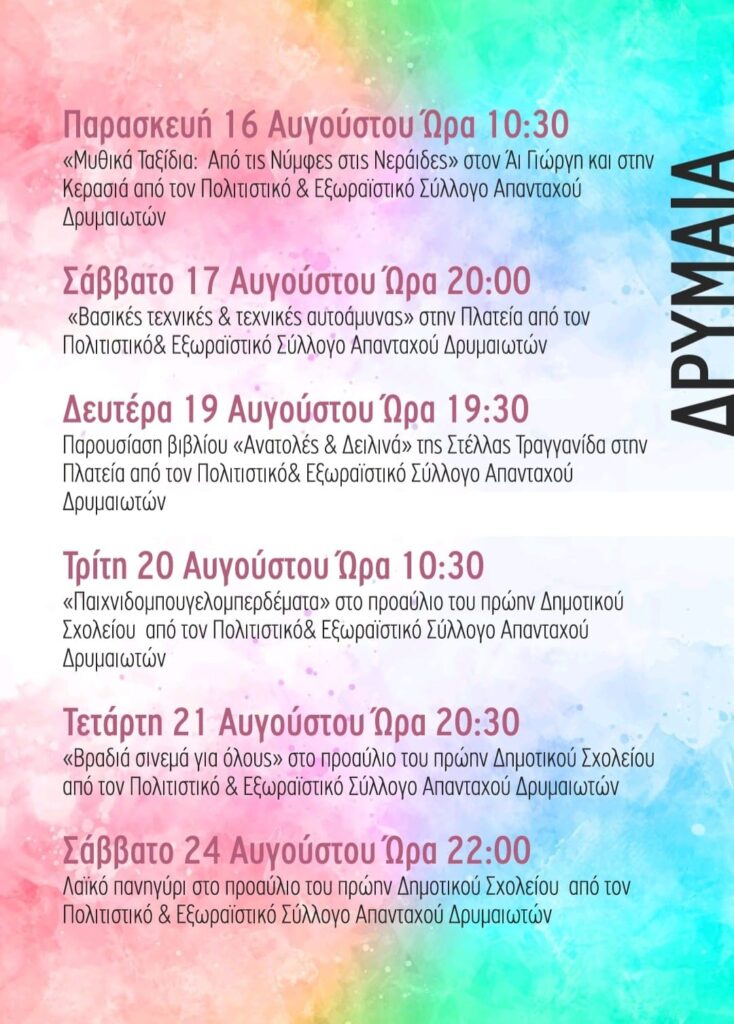 Όμορφες και άρτια οργανωμένες εκδηλώσεις, για όλα τα γούστα και όλες τις ηλικίες, που διαδέχονται η μία την άλλη με σκοπό να μας ψυχαγωγήσουν και να δώσουν ζωή στα χωριά μας. Κάθε μία ιδιαίτερη και όλες τους επιτυχημένες, γιατί προετοιμάζονται με μπόλικη δόση… αγάπης!