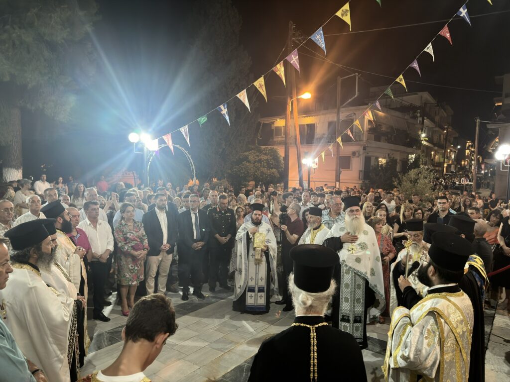 Την παραμονή της εορτής, Τετάρτη 14 Αυγούστου, ο Σεβασμιώτατος χοροστάτησε στον πανηγυρικό Εσπερινό στον Ιερό Ναό Μεγάλης Παναγίας – Αγίου Δημητρίου Θηβών, πλαισιούμενος από πολλούς ιερείς, τη στρατιωτική και πολιτική ηγεσία της περιοχής και μια λαοθάλασσα πιστών που κατέκλυσαν τον ιστορικό Ναό των Θηβών για να προσκυνήσουν τη θαυματουργή εικόνα της Μεγαλόχαρης. Μετά τον Εσπερινό ακολούθησε η λιτάνευση της εικόνας της Παναγίας στους δρόμους της πόλης.
