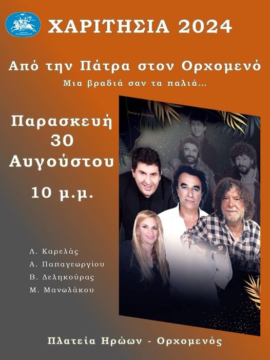 Σας περιμένουμε την Παρασκευή, 30 Αυγούστου 2024, στην κεντρική πλατεία Ορχομενου σε μια βραδιά σαν τα παλιά …