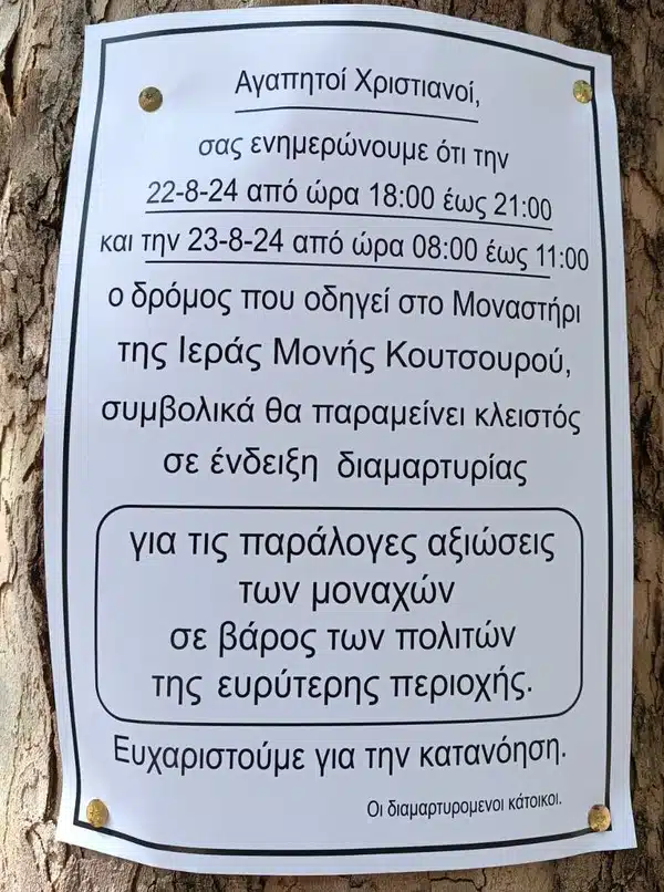 Αγαπητοί Χριστιανοί,σας ενημερώνουμε ότι την 22-8-24 από ώρα 18:00 έως 21:00 και την 23-8-24 από ώρα 08:00 έως 11:00 ο δρόμος που οδηγεί στο Μοναστήρι της Ιεράς Μονής Κουτσουρού, συμβολικά θα παραμείνει κλειστός σε ένδειξη διαμαρτυρίας για τις παράλογες αξιώσεις των μοναχών σε βάρος των πολιτών της ευρύτερης περιοχής.
