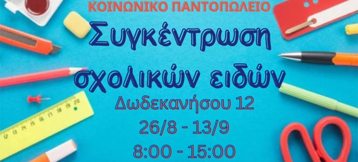 Η συγκέντρωση των σχολικών ειδών θα γίνεται στο Κοινωνικό Παντοπωλείο, οδός Δωδεκανήσου 12, από Δευτέρα 26/08/2024 έως Παρασκευή 13/09/2024 και ώρες 08:00-15:00 μ.μ.