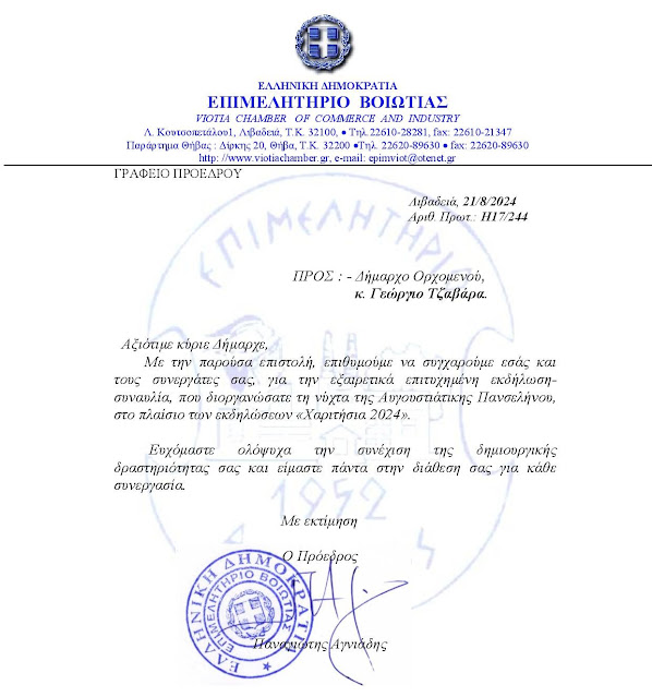 Β͇ο͇ι͇ω͇τ͇ί͇α͇ Αγνιάδης:Συγχαρητήρια επιστολή στον Δήμαρχο Ορχομενού admin 23 Αυγούστου, 2024 Tags: Δήμος Ορχομενού Επιμελητήριο Βοιωτίας Post navigation Previous Πρόσκληση στο ΚυριάκιNext Αιματηρό επεισόδιο στο πανηγύρι του Μαραθιά Αφήστε μια απάντηση Ακύρωση απάντησηςΗ ηλ. διεύθυνση σας δεν δημοσιεύεται. Τα υποχρεωτικά πεδία σημειώνονται με *Σχόλιο * Όνομα * Email * Ιστότοπος Αποθήκευσε το όνομά μου, email, και τον ιστότοπο μου σε αυτόν τον πλοηγό για την επόμενη φορά που θα σχολιάσω. Related Stories Πάσχα 2026 Β͇ο͇ι͇ω͇τ͇ί͇α͇ Πάσχα 2026 15 Απριλίου, 2026 Μουλκιώτης:Φιάσκο η πληρωμή των αγροτικών ενισχύσεων της 7ης Απριλίου Β͇ο͇ι͇ω͇τ͇ί͇α͇ Μουλκιώτης:Φιάσκο η πληρωμή των αγροτικών ενισχύσεων της 7ης Απριλίου 15 Απριλίου, 2026 Κατάθεση αιτήσεων από τους αγρότες για τη χρήση του δικτύου άρδευσης Β͇ο͇ι͇ω͇τ͇ί͇α͇ Κατάθεση αιτήσεων από τους αγρότες για τη χρήση του δικτύου άρδευσης 15 Απριλίου, 2026