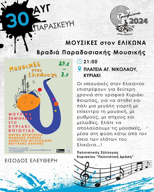 Εκεί στον τόπο κατοικίας του αιώνιου έφηβου «μουσαγέτη» Απόλλωνα, δάσκαλου των εννέα Ελικωνιάδων Μουσών, θα πραγματοποιηθούν οι «Μουσικές στον Ελικώνα 2024», μια γιορτή της μουσικής, από το απόγευμα στις 30 Αυγούστου έως το μεσημέρι στις 2 Σεπτεμβρίου, με την Μάρθα Φριντζήλα, τον Μανώλη Πάππο, τον Δημήτρη Μυστακίδη και τον Βαγγέλη Καρίπη.