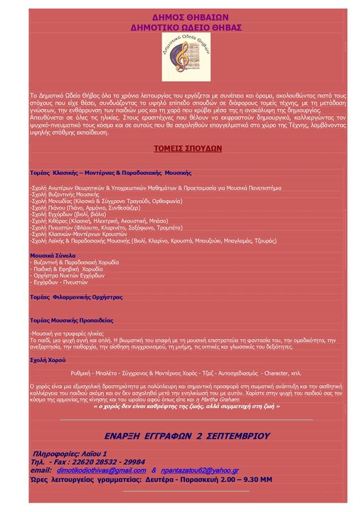 Θ͟͞ή͟͞β͟͞α͟͞ Δημοτικό Ωδείο Θήβας:Έναρξη Εγγραφών admin 30 Αυγούστου, 2024 Tags: Δημοτικό Ωδείο Θήβας Post navigation Previous Ενημέρωση του Δημάρχου Δελφών για τη λειτουργία του Φορέα Διαχείρισης του Ελαιώνα της ΆμφισσαςNext 6η συνάντηση Χορωδιών Κυριακίου Αφήστε μια απάντηση Ακύρωση απάντησηςΗ ηλ. διεύθυνση σας δεν δημοσιεύεται. Τα υποχρεωτικά πεδία σημειώνονται με *Σχόλιο * Όνομα * Email * Ιστότοπος Αποθήκευσε το όνομά μου, email, και τον ιστότοπο μου σε αυτόν τον πλοηγό για την επόμενη φορά που θα σχολιάσω. Related Stories Η νέα σειρά ιστορικών ντοκιμαντέρ της ΕΡΤ 3 ταξιδεύει στην Θήβα Θ͟͞ή͟͞β͟͞α͟͞ Ιστορίες Μνήμης Η νέα σειρά ιστορικών ντοκιμαντέρ της ΕΡΤ 3 ταξιδεύει στην Θήβα 16 Απριλίου, 2026 Διακοπή ρεύματος στη Θήβα & σε χωριά Θ͟͞ή͟͞β͟͞α͟͞ Διακοπή ρεύματος στη Θήβα & σε χωριά 15 Απριλίου, 2026 Σύγκληση ΤΕΣΟΠ στο Γραφείο Δημάρχου του Δήμου Θηβαίων Θ͟͞ή͟͞β͟͞α͟͞ Σύγκληση ΤΕΣΟΠ στο Γραφείο Δημάρχου του Δήμου Θηβαίων 15 Απριλίου, 2026