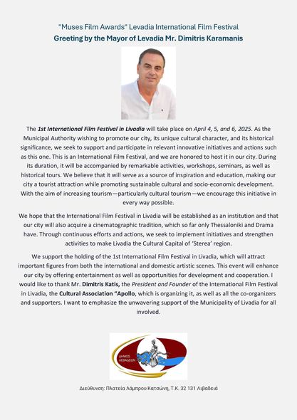 The Mayor of Livadia, Mr. Dimitris Karamanis, has sent us an official letter of greeting expressing substantial support and a commitment to direct municipal cooperation for the first ‘Levadia International Film Festival – Muses Film Awards’. Below is the greeting in both Greek and English. It will soon be posted on the festival’s official website.