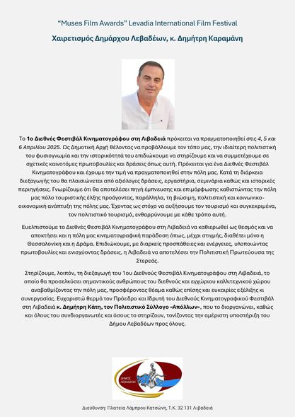 Ο Δήμαρχος Λεβαδέων κ.Δημήτρης Καραμάνης μας στέλνει επίσημο χαιρετισμό για ουσιαστική υποστήριξη και άμεση δημοτική συμβολή και συνεργασία, για και προς, το πρώτο “Διεθνές Κινηματογραφικό Φεστιβάλ Λιβαδειάς – Muses Film Awards”. Ακολουθεί το κείμενο σε ελληνικά και αγγλικά. Σύντομα θα αναρτηθεί και στην επίσημη σελίδα του φεστιβάλ!