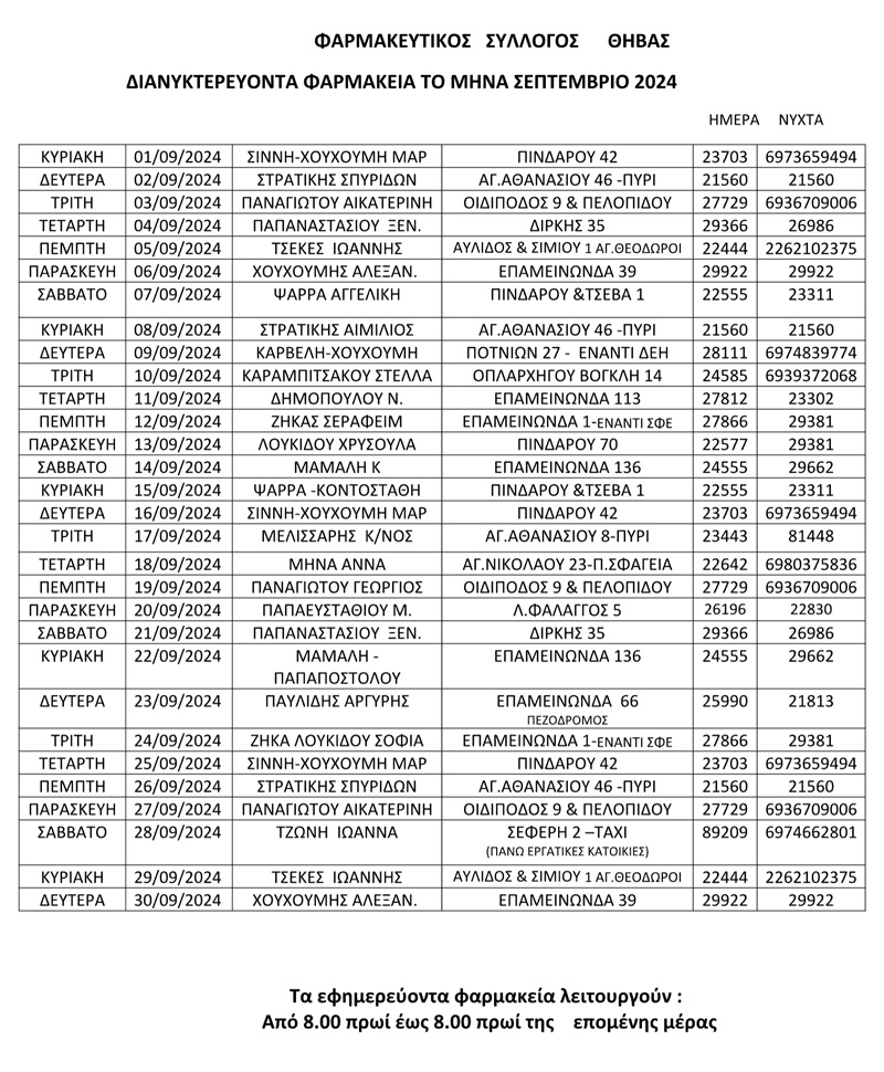 Θ͟͞ή͟͞β͟͞α͟͞ Φαρμακευτικός Σύλλογος Θήβας:Εφημερίες Σεπτέμβριος 2024 admin 2 Σεπτεμβρίου, 2024 Tags: εφημερίες ΘΗΒΑ Σεπτέμβριος εφημερίες Φαρμακεία Φαρμακευτικός Σύλλογος Θήβας Post navigation Previous Φιλανθρωπικός Αγώνας Ποδοσφαίρου στην ΑμφίκλειαNext Οι εγγραφές για την Δημοτική Φιλαρμονική Καρπενησίου άρχισαν Αφήστε μια απάντηση Ακύρωση απάντησηςΗ ηλ. διεύθυνση σας δεν δημοσιεύεται. Τα υποχρεωτικά πεδία σημειώνονται με *Σχόλιο * Όνομα * Email * Ιστότοπος Αποθήκευσε το όνομά μου, email, και τον ιστότοπο μου σε αυτόν τον πλοηγό για την επόμενη φορά που θα σχολιάσω. Related Stories Διακοπή ρεύματος στη Θήβα & σε χωριά Θ͟͞ή͟͞β͟͞α͟͞ Διακοπή ρεύματος στη Θήβα & σε χωριά 15 Απριλίου, 2026 Σύγκληση ΤΕΣΟΠ στο Γραφείο Δημάρχου του Δήμου Θηβαίων Θ͟͞ή͟͞β͟͞α͟͞ Σύγκληση ΤΕΣΟΠ στο Γραφείο Δημάρχου του Δήμου Θηβαίων 15 Απριλίου, 2026 📢📣 Κυκλοφοριακές ρυθμίσεις για την εκτέλεση εργασιών του έργου «Αποκαταστάσεις ζημιών από φυσικές καταστροφές» Θ͟͞ή͟͞β͟͞α͟͞ 📢📣 Κυκλοφοριακές ρυθμίσεις για την εκτέλεση εργασιών του έργου «Αποκαταστάσεις ζημιών από φυσικές καταστροφές» 15 Απριλίου, 2026