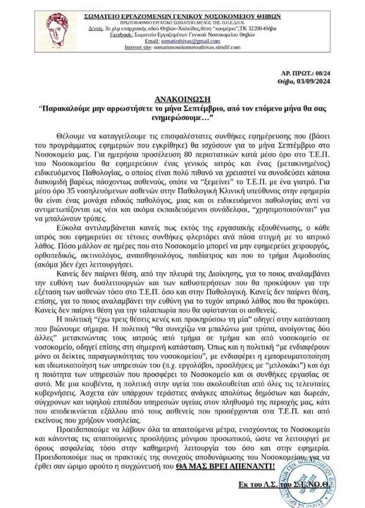 Θ͟͞ή͟͞β͟͞α͟͞ Σωματείο Εργαζομένων Γενικού Νοσοκομείου Θηβών:Ανακοίνωση admin 3 Σεπτεμβρίου, 2024 Σωματείο Εργαζομένων Γενικού Νοσοκομείου Θηβών Tags: ΘΗΒΑ Σωματείο Εργαζομένων Γενικού Νοσοκομείου Θηβών Post navigation Previous Πούλου:Ευχαριστήριο στους ηθοποιούς των δομών ΕΠΑΨΥNext Καθυστερήσεις στο Περιφερειακό Πρόγραμμα Ανάπτυξης (ΠΠΑ) Στ. Ελλάδας Περιόδου 2021-2025 Αφήστε μια απάντηση Ακύρωση απάντησηςΗ ηλ. διεύθυνση σας δεν δημοσιεύεται. Τα υποχρεωτικά πεδία σημειώνονται με *Σχόλιο * Όνομα * Email * Ιστότοπος Αποθήκευσε το όνομά μου, email, και τον ιστότοπο μου σε αυτόν τον πλοηγό για την επόμενη φορά που θα σχολιάσω. Related Stories Διακοπή ρεύματος στη Θήβα & σε χωριά Θ͟͞ή͟͞β͟͞α͟͞ Διακοπή ρεύματος στη Θήβα & σε χωριά 15 Απριλίου, 2026 Σύγκληση ΤΕΣΟΠ στο Γραφείο Δημάρχου του Δήμου Θηβαίων Θ͟͞ή͟͞β͟͞α͟͞ Σύγκληση ΤΕΣΟΠ στο Γραφείο Δημάρχου του Δήμου Θηβαίων 15 Απριλίου, 2026 📢📣 Κυκλοφοριακές ρυθμίσεις για την εκτέλεση εργασιών του έργου «Αποκαταστάσεις ζημιών από φυσικές καταστροφές» Θ͟͞ή͟͞β͟͞α͟͞ 📢📣 Κυκλοφοριακές ρυθμίσεις για την εκτέλεση εργασιών του έργου «Αποκαταστάσεις ζημιών από φυσικές καταστροφές» 15 Απριλίου, 2026