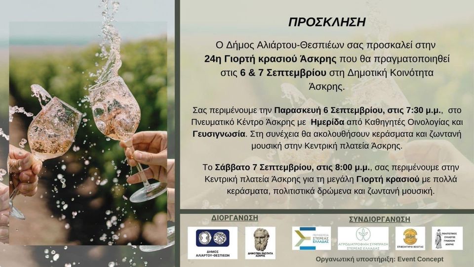 Ε͟κ͟δ͟η͟λ͟ώ͟σ͟ε͟ι͟ς͟ 24η Γιορτή Κρασιού στην Άσκρη admin 4 Σεπτεμβρίου, 2024 Tags: 24η Γιορτή Κρασιού στην Άσκρη Δήμος Αλιάρτου Θεσπιέων Post navigation Previous «Χιονοδρομικό Κέντρο Παρνασσού ώρα μηδέν»Next “Τελείωσε με εμάς” στον θερινό κινηματογράφο ΣΟΝΙΑ Αφήστε μια απάντηση Ακύρωση απάντησηςΗ ηλ. διεύθυνση σας δεν δημοσιεύεται. Τα υποχρεωτικά πεδία σημειώνονται με *Σχόλιο * Όνομα * Email * Ιστότοπος Αποθήκευσε το όνομά μου, email, και τον ιστότοπο μου σε αυτόν τον πλοηγό για την επόμενη φορά που θα σχολιάσω. Related Stories Ο Όμιλος Φίλων Θεάτρου Λιβαδειάς ανεβάζει την παράσταση “Εχθροί εξ Αίματος” του Αρκά Ε͟κ͟δ͟η͟λ͟ώ͟σ͟ε͟ι͟ς͟ Ο Όμιλος Φίλων Θεάτρου Λιβαδειάς ανεβάζει την παράσταση “Εχθροί εξ Αίματος” του Αρκά 15 Απριλίου, 2026 Ο Πολιτιστικός Σύλλογος Αρκίτσας ” Ο Κλείδωνας” αναβίωσε το έθιμο της «Ρωμάνας» Ε͟κ͟δ͟η͟λ͟ώ͟σ͟ε͟ι͟ς͟ Ο Πολιτιστικός Σύλλογος Αρκίτσας ” Ο Κλείδωνας” αναβίωσε το έθιμο της «Ρωμάνας» 14 Απριλίου, 2026 ➡️ Μια ξεχωριστή βραδιά γεμάτη εθελοντισμό, αλληλεγγύη και κοινωνική προσφορά, την Τετάρτη στις 20:00 στον Πολυχώρο Πολιτισμού! Ε͟κ͟δ͟η͟λ͟ώ͟σ͟ε͟ι͟ς͟ ➡️ Μια ξεχωριστή βραδιά γεμάτη εθελοντισμό, αλληλεγγύη και κοινωνική προσφορά, την Τετάρτη στις 20:00 στον Πολυχώρο Πολιτισμού! 14 Απριλίου, 2026