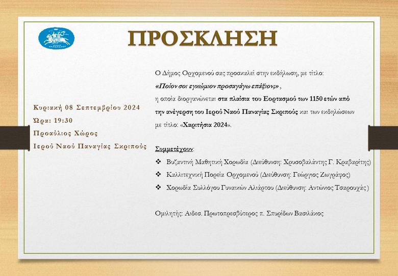 Θα είναι ιδιαίτερη τιμή για εμάς, η παρουσία σας στην εκδήλωση «Ποιον Σοι Εγκώμιον Προσαγάγω Επάξιον;», η οποία διοργανώνεται στα πλαίσια του εορτασμού των 1150 χρόνων από την ανέγερση του Ιερού Ναού Παναγίας Σκριπού.