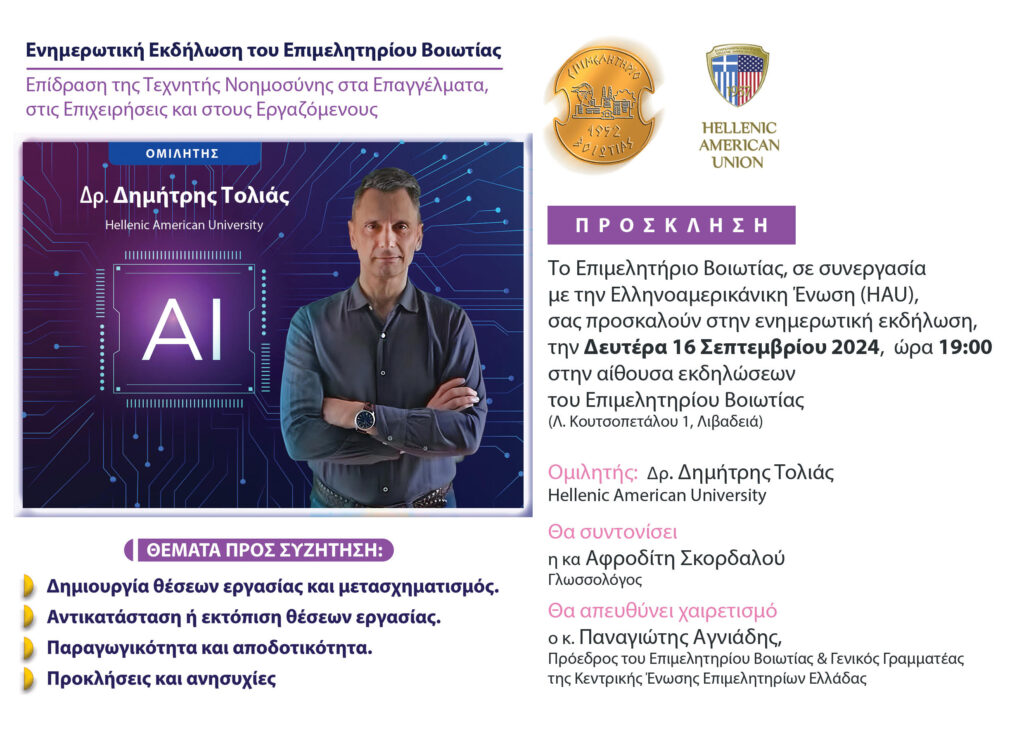 Το Επιμελητήριο Βοιωτίας, σε συνεργασία με την Ελληνοαμερικάνικη Ένωση (HAU), Θα πραγματοποιήσουν ενημερωτική εκδήλωση, με θέμα: «Επίδραση της Τεχνητής Νοημοσύνης στα Επαγγέλματα, στις Επιχειρήσεις και στους Εργαζόμενους»