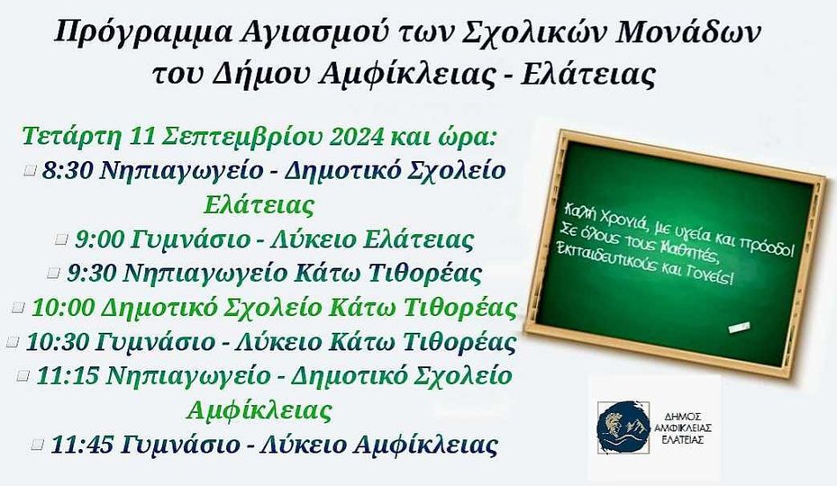 Με την άριστη συνεργασία Δήμου και Διευθυντριών / Διευθυντών των σχολικών μονάδων έγιναν όλες οι απαιτούμενες ενέργειες, ώστε τα σχολεία μας να είναι, καθόλα, έτοιμα να υποδεχτούν τους μαθητές μας. Το πρώτο κουδούνι χτυπάει την Τετάρτη 11 Σεπτεμβρίου 2024 και ο καθιερωμένος αγιασμός θα πραγματοποιηθεί σύμφωνα με το ακόλουθο πρόγραμμα.