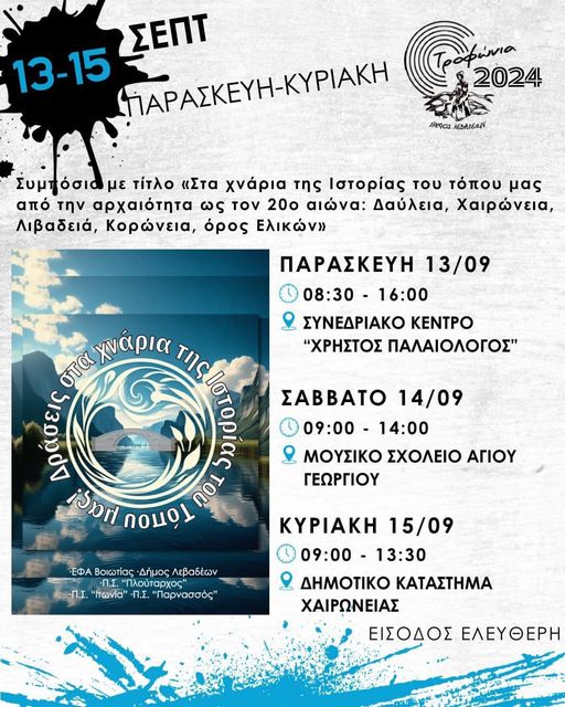 Η Εφορεία Αρχαιοτήτων Βοιωτίας και ο Δήμος Λεβαδέων με τους τοπικούς πολιτιστικούς Συλλόγους «Ο Πλούταρχος» της Χαιρώνειας, «Ο Παρνασσός» της Δαύλειας και «Ιτωνία» του Αγίου Γεωργίου συνδιοργανώνουν, με τη στήριξη και συμμετοχή της Δημόσιας Βιβλιοθήκης Λιβαδειάς και των ΓΑΚ Φθιώτιδας, δράσεις με θέμα «Στα χνάρια της ιστορίας του τόπου μας» που αφορούν περιοχές και