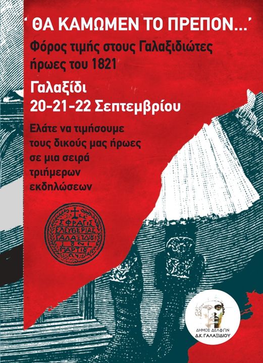 Ο Δήμος Δελφών και η Δημοτική Κοινότητα Γαλαξιδίου, σε συνεργασία με συλλόγους, φορείς και εθελοντές, διοργανώνουν τις επετειακές εκδηλώσεις μνήμης και τιμής στους Γαλαξιδιώτες ήρωες του 1821, «Θα Κάμωμεν το Πρέπον», από την Παρασκευή 20 έως την Κυριακή 22 Σεπτεμβρίου 2024.