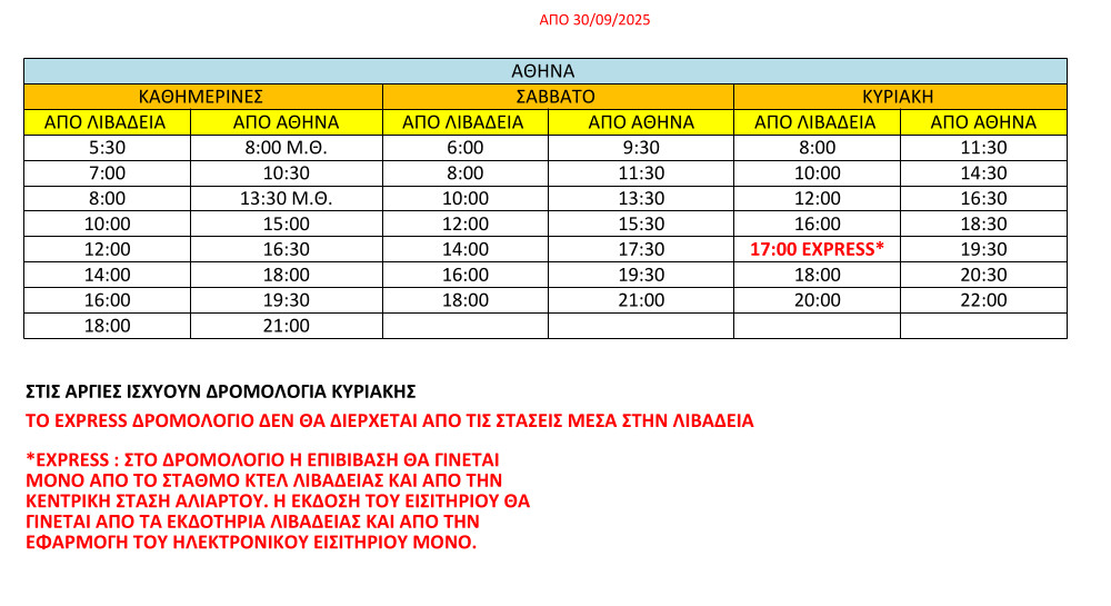 Από την Κυριακή 5 Οκτωβρίου και κάθε Κυριακή θα υπάρχει νέο δρομολόγιο του ΚΤΕΛ, από Λιβαδειά προς Αθήνα, στις 17:00, το οποίο θα είναι express.