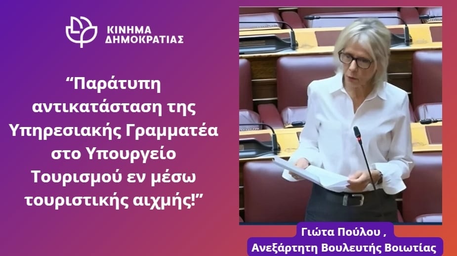Κατέθεσα Ερώτηση με Αίτημα Κατάθεσης Εγγράφων στη Βουλή, προς την Υπουργό Τουρισμού και τον Υπουργό Εσωτερικών, με τη συνυπογραφή των ανεξάρτητων βουλευτών του Κινήματος Δημοκρατίας, αναδεικνύοντας ένα θέμα που εγείρει σοβαρά ζητήματα χρηστής διοίκησης. Το Υπουργείο Τουρισμού βρέθηκε χωρίς Υπηρεσιακό Γραμματέα από τις 4 Ιουλίου έως τις 5 Σεπτεμβρίου 2025, στην κορύφωση της τουριστικής περιόδου, λόγω της μετακίνησης της Υπηρεσιακής Γραμματέως στη θέση της Διευθύνουσας Συμβούλου της Εταιρείας Αξιοποίησης Ακίνητης Περιουσίας του e-ΕΦΚΑ, με απόφαση της Υπουργού Εργασίας και Κοινωνικής Ασφάλισης.