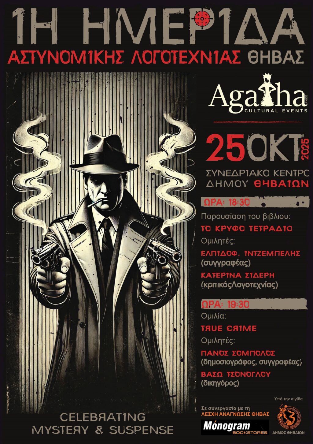 Ο Δήμος Θηβαίων σας προσκαλεί στην 1η Ημερίδα Αστυνομικής Λογοτεχνίας που θα διεξαχθεί το Σάββατο 25 Οκτωβρίου 2025 στο Συνεδριακό Κέντρο Δήμου Θηβαίων. Η Agatha Cultural Events σε συνεργασία με τη Λέσχη Ανάγνωσης Θήβας και το Monogram Bookstore παρουσιάζουν μια ημερίδα ειδικού ενδιαφέροντος για τους λάτρεις των ιστοριών μυστηρίου και αγωνίας!