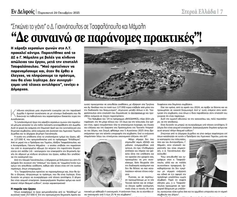 ¨Όσο για την περιβόητη κατάτμηση, εμείς ακολουθήσαμε μία διαδικασία όπως μας ενημέρωσαν, η οποία πέρασε από το ΔΣ του ΔΛΤ (ομόφωνα), Τεχνικές Υπηρεσίες,του Δήμου, έγκριση του ΓΓ του Ναυτιλίας, Δημοτικό Συμβούλιο Δωρίδος (σχεδόν ομόφωνα), έγκριση της αποκεντρωμένης Διοικησης και περιμένουμε από τον κ. Γιαννόπουλο, πέραν από τις προφορικές συζητήσεις χωρίς νομική υπόσταση , να προσκομίσει έγγραφο από ανάλογες Υπηρεσίες που να κάνουν τον συγκεκριμένο χαρακτηρισμό (κατάτμηση)..