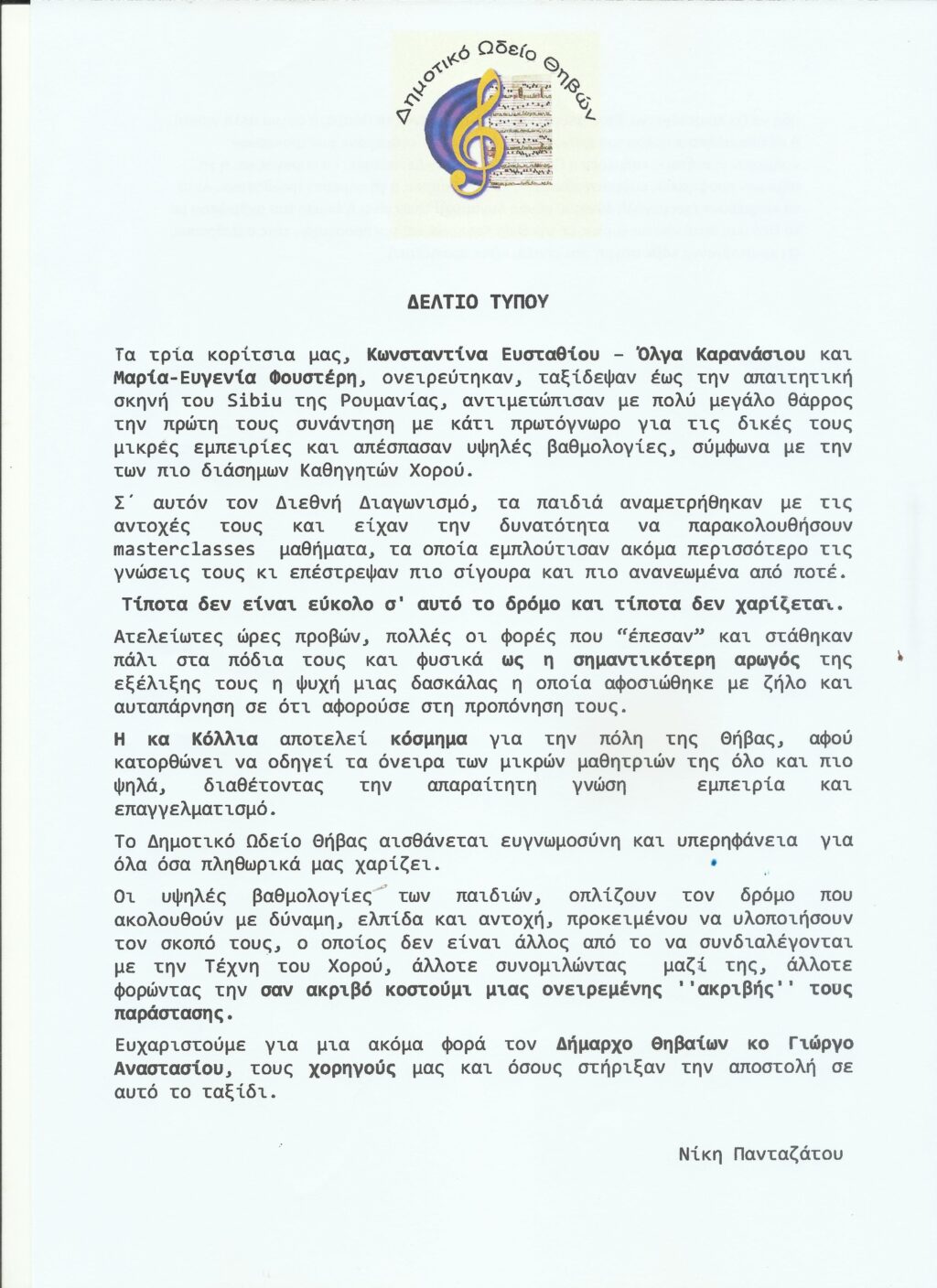 Θ͟͞ή͟͞β͟͞α͟͞ Το Δημοτικό Ωδείο Θηβών για την διεθνή πολιτιστική συνάντηση στο Sibiu της Ρουμανίας admin 27 Οκτωβρίου, 2025 Tags: Δημοτικό Ωδείο Θήβας Continue Reading Previous: Εμπορικός Σύλλογος Θήβας για το πολυκατάστημα LIDLNext: Εσπερινός Αγίας Ταβιθάς Αφήστε μια απάντηση Ακύρωση απάντησηςΗ ηλ. διεύθυνση σας δεν δημοσιεύεται. Τα υποχρεωτικά πεδία σημειώνονται με *Σχόλιο * Όνομα * Email * Ιστότοπος Αποθήκευσε το όνομά μου, email, και τον ιστότοπο μου σε αυτόν τον πλοηγό για την επόμενη φορά που θα σχολιάσω. Related Stories Δήμαρχος Θηβαίων: “28η Οκτωβρίου, ημέρα μνήμης και εθνικής υπερηφάνειας” Θ͟͞ή͟͞β͟͞α͟͞ Δήμαρχος Θηβαίων: “28η Οκτωβρίου, ημέρα μνήμης και εθνικής υπερηφάνειας” 28 Οκτωβρίου, 2025 Πρόσκληση σύγκλησης Δημοτικού Συμβουλίου Θ͟͞ή͟͞β͟͞α͟͞ Πρόσκληση σύγκλησης Δημοτικού Συμβουλίου 28 Οκτωβρίου, 2025 Στα Χώστια τιμήσανε την Εθνική Επέτειο της 28ης Οκτωβρίου Θ͟͞ή͟͞β͟͞α͟͞ Στα Χώστια τιμήσανε την Εθνική Επέτειο της 28ης Οκτωβρίου 28 Οκτωβρίου, 2025