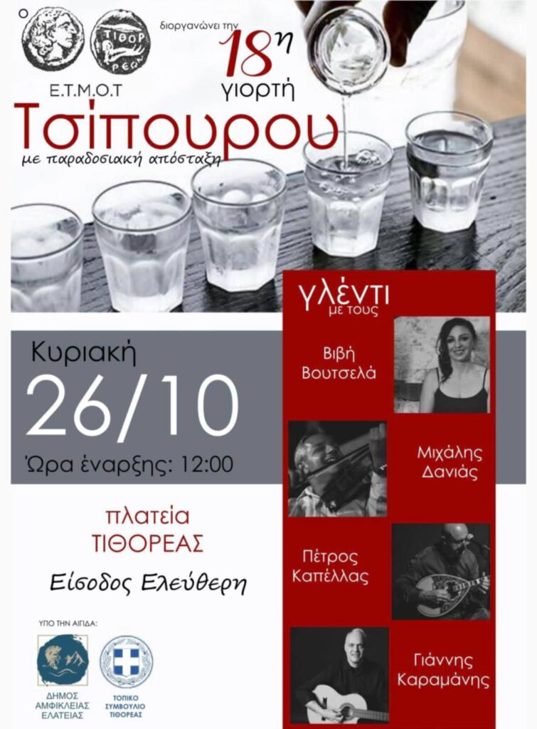 ➡️ Ο Εκπολιτιστικός Τουριστικός Μορφωτικός Όμιλος Τιθορέας (Ε.Τ.Μ.Ο.Τ.) μας προσκαλεί στη 18η Γιορτή Τσίπουρου με παραδοσιακή απόσταξη, την Κυριακή 26 Οκτωβρίου 2025 και ώρα 12:00μ.μ. στην κεντρική πλατεία της Τιθορέας. Εκεί θα βρίσκεται και η Βιβή Βουτσελά, με τους Μιχάλη Δανιά, Πέτρο Καπέλλα και Γιάννη Καραμάνη, προκειμένου να μας ξεσηκώσουν με τις μουσικές επιλογές τους!
