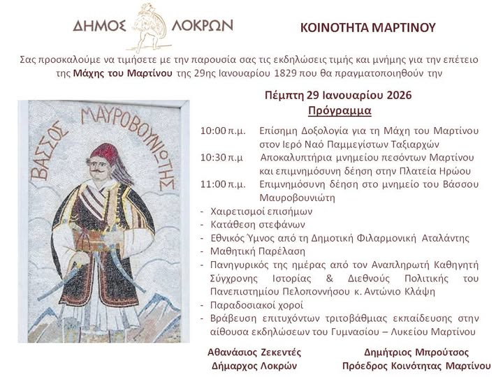 Ε͟κ͟δ͟η͟λ͟ώ͟σ͟ε͟ι͟ς͟ Η Μάχη του Μαρτίνου admin 14 Ιανουαρίου, 2026 Tags: Δήμος Λοκρών Post navigation Previous 👉Με επιτυχία η πρώτη εθελοντική Αιμοδοσία για το 2026Next Ο Δήμος Λοκρών εντάσσεται επιτυχώς στο πρόγραμμα WiFi4GR Αφήστε μια απάντηση Ακύρωση απάντησηςΗ ηλ. διεύθυνση σας δεν δημοσιεύεται. Τα υποχρεωτικά πεδία σημειώνονται με *Σχόλιο * Όνομα * Email * Ιστότοπος Αποθήκευσε το όνομά μου, email, και τον ιστότοπο μου σε αυτόν τον πλοηγό για την επόμενη φορά που θα σχολιάσω. Related Stories 🎉Αποκριάτικο party στην Άμφισσα για την έναρξη των Αποκριών Ε͟κ͟δ͟η͟λ͟ώ͟σ͟ε͟ι͟ς͟ 🎉Αποκριάτικο party στην Άμφισσα για την έναρξη των Αποκριών 3 Φεβρουαρίου, 2026 3η Μαθητική Αποκριάτικη Παρέλαση Θήβας : Κανόνες & Όροι Συμμετοχής Ε͟κ͟δ͟η͟λ͟ώ͟σ͟ε͟ι͟ς͟ 3η Μαθητική Αποκριάτικη Παρέλαση Θήβας : Κανόνες & Όροι Συμμετοχής 3 Φεβρουαρίου, 2026 Εκδήλωση με επίκεντρο τις πρόσφατες αλλαγές στο εργασιακό πλαίσιο και την εφαρμογή της Ψηφιακής Κάρτας Εργασίας διοργάνωσε ο Σύλλογος Φοροτεχνικών Ελευθέρων Επαγγελματιών Θηβών Βοιωτίας Ε͟κ͟δ͟η͟λ͟ώ͟σ͟ε͟ι͟ς͟ Εκδήλωση με επίκεντρο τις πρόσφατες αλλαγές στο εργασιακό πλαίσιο και την εφαρμογή της Ψηφιακής Κάρτας Εργασίας διοργάνωσε ο Σύλλογος Φοροτεχνικών Ελευθέρων Επαγγελματιών Θηβών Βοιωτίας 3 Φεβρουαρίου, 2026
