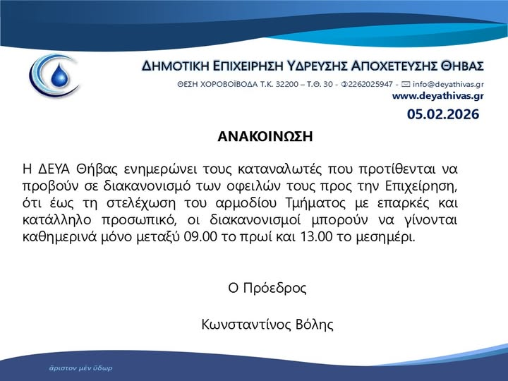 Θ͟͞ή͟͞β͟͞α͟͞ ΔΕΥΑΘ:Ενημέρωση admin 5 Φεβρουαρίου, 2026 Tags: ΔΕΥΑΘ ΘΗΒΑ Post navigation Previous Τροχαίο με θανατηφόρα παράσυρση πεζού σημειώθηκε στην ΘήβαNext Η κυβέρνηση των υπερεξοπλισμών διαλύει την ΕΑΒ Αφήστε μια απάντηση Ακύρωση απάντησηςΗ ηλ. διεύθυνση σας δεν δημοσιεύεται. Τα υποχρεωτικά πεδία σημειώνονται με *Σχόλιο * Όνομα * Email * Ιστότοπος Αποθήκευσε το όνομά μου, email, και τον ιστότοπο μου σε αυτόν τον πλοηγό για την επόμενη φορά που θα σχολιάσω. Related Stories Διακοπή ρεύματος στη Θήβα & σε χωριά Θ͟͞ή͟͞β͟͞α͟͞ Διακοπή ρεύματος στη Θήβα & σε χωριά 15 Απριλίου, 2026 Σύγκληση ΤΕΣΟΠ στο Γραφείο Δημάρχου του Δήμου Θηβαίων Θ͟͞ή͟͞β͟͞α͟͞ Σύγκληση ΤΕΣΟΠ στο Γραφείο Δημάρχου του Δήμου Θηβαίων 15 Απριλίου, 2026 📢📣 Κυκλοφοριακές ρυθμίσεις για την εκτέλεση εργασιών του έργου «Αποκαταστάσεις ζημιών από φυσικές καταστροφές» Θ͟͞ή͟͞β͟͞α͟͞ 📢📣 Κυκλοφοριακές ρυθμίσεις για την εκτέλεση εργασιών του έργου «Αποκαταστάσεις ζημιών από φυσικές καταστροφές» 15 Απριλίου, 2026