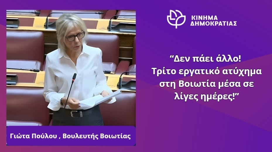 ⚠️ Το περιστατικό αυτό αποτελεί το τρίτο εργατικό ατύχημα στην περιοχή της Βοιωτίας μέσα σε ελάχιστες ημέρες, με θλιβερό απολογισμό έναν νεκρό και δύο σοβαρά τραυματίες. Η επανειλημμένη τραγωδία καταδεικνύει την κρισιμότητα της κατάστασης στους χώρους εργασίας και την ανάγκη άμεσης παρέμβασης. Σύμφωνα με την Καταγγελία του Εργατικού Κέντρου Θήβας που κατέθεσα σήμερα ως Αναφορά στη Βουλή προς την Υπουργό Εργασίας και Κοινωνικής Ασφάλισης, απαιτείται άμεση διερεύνηση των αιτιών από την Επιθεώρηση Εργασίας, απόδοση ευθυνών στους υπεύθυνους, ενίσχυση των ελέγχων υγείας και ασφάλειας στους χώρους εργασίας και μέτρα πρόληψης για να σταματήσει η αιματοβαμμένη αλυσίδα των εργατικών ατυχημάτων.