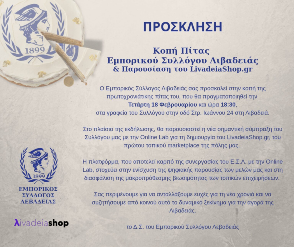 Ο Εμπορικός Σύλλογος Λιβαδειάς θα κόψει την πρωτοχρονιάτικη πίτα, στα γραφεία του, την Τετάρτη 18 Φεβρουαρίου στις 18:30.