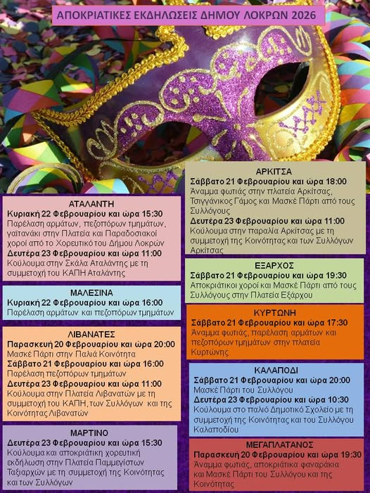 Ε͟κ͟δ͟η͟λ͟ώ͟σ͟ε͟ι͟ς͟ Απόκριες 2026 στον Δήμο Λοκρών admin 13 Φεβρουαρίου, 2026 Tags: Δήμος Λοκρών Post navigation Previous Αποκριάτικο Απόγευμα στα ΚΑΠΗ ΑταλάντηςNext Δράση ενημέρωσης για την ΠΑΓΚΟΣΜΙΑ ΗΜΕΡΑ ΚΑΤΑ ΤΟΥ ΠΑΙΔΙΚΟΥ ΚΑΡΚΙΝΟΥ Αφήστε μια απάντηση Ακύρωση απάντησηςΗ ηλ. διεύθυνση σας δεν δημοσιεύεται. Τα υποχρεωτικά πεδία σημειώνονται με *Σχόλιο * Όνομα * Email * Ιστότοπος Αποθήκευσε το όνομά μου, email, και τον ιστότοπο μου σε αυτόν τον πλοηγό για την επόμενη φορά που θα σχολιάσω. Related Stories Ο Όμιλος Φίλων Θεάτρου Λιβαδειάς ανεβάζει την παράσταση “Εχθροί εξ Αίματος” του Αρκά Ε͟κ͟δ͟η͟λ͟ώ͟σ͟ε͟ι͟ς͟ Ο Όμιλος Φίλων Θεάτρου Λιβαδειάς ανεβάζει την παράσταση “Εχθροί εξ Αίματος” του Αρκά 15 Απριλίου, 2026 Ο Πολιτιστικός Σύλλογος Αρκίτσας ” Ο Κλείδωνας” αναβίωσε το έθιμο της «Ρωμάνας» Ε͟κ͟δ͟η͟λ͟ώ͟σ͟ε͟ι͟ς͟ Ο Πολιτιστικός Σύλλογος Αρκίτσας ” Ο Κλείδωνας” αναβίωσε το έθιμο της «Ρωμάνας» 14 Απριλίου, 2026 ➡️ Μια ξεχωριστή βραδιά γεμάτη εθελοντισμό, αλληλεγγύη και κοινωνική προσφορά, την Τετάρτη στις 20:00 στον Πολυχώρο Πολιτισμού! Ε͟κ͟δ͟η͟λ͟ώ͟σ͟ε͟ι͟ς͟ ➡️ Μια ξεχωριστή βραδιά γεμάτη εθελοντισμό, αλληλεγγύη και κοινωνική προσφορά, την Τετάρτη στις 20:00 στον Πολυχώρο Πολιτισμού! 14 Απριλίου, 2026