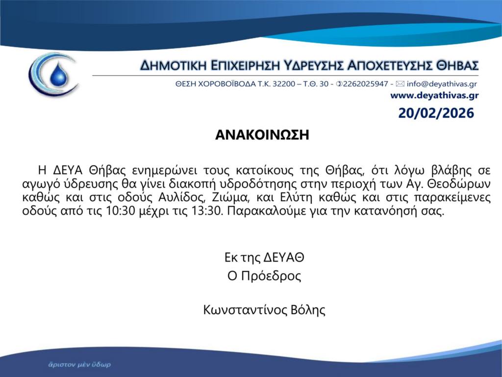 Θ͟͞ή͟͞β͟͞α͟͞ ΔΕΥΑΘ:Διακοπή υδροδότησης στους Αγίους Θεοδώρους admin 20 Φεβρουαρίου, 2026 Tags: ΔΕΥΑΘ ΘΗΒΑ Post navigation Previous Διακοπή υδροδότησης στο ΜελισσοχώριNext 🔴𝝨𝝶𝝻𝝰𝝼𝞃𝝸𝝹ό έ𝞀𝝲𝝾 𝞄𝝿𝝾𝝲𝝴𝝸𝝾𝝿𝝾ί𝝶𝞂𝝶ς 𝝳𝝸𝝹𝞃ύ𝞈𝝼 𝝹𝝰𝝸 𝝰𝝼𝝰𝝱ά𝝷𝝻𝝸𝞂𝝶ς 𝝾𝝳𝝾𝞅𝞈𝞃𝝸𝞂𝝻𝝾ύ 𝞂𝞃𝝾𝝼 𝝙ή𝝻𝝾 𝝟𝝰𝞀𝝿𝝴𝝼𝝶𝞂ί𝝾𝞄 – 𝝟𝝰𝞃ά𝝷𝝴𝞂𝝶 𝝿𝞀ό𝞃𝝰𝞂𝝶ς 𝞆𝞀𝝶𝝻𝝰𝞃𝝾𝝳ό𝞃𝝶𝞂𝝶ς 𝞂𝝴 𝞂𝞄𝝼𝝴𝞀𝝲𝝰𝞂ί𝝰 𝝻𝝴 𝞃𝝾𝝼 𝝙𝝚𝝙𝝙𝝜𝝚 Αφήστε μια απάντηση Ακύρωση απάντησηςΗ ηλ. διεύθυνση σας δεν δημοσιεύεται. Τα υποχρεωτικά πεδία σημειώνονται με *Σχόλιο * Όνομα * Email * Ιστότοπος Αποθήκευσε το όνομά μου, email, και τον ιστότοπο μου σε αυτόν τον πλοηγό για την επόμενη φορά που θα σχολιάσω. Related Stories Διακοπή ρεύματος στη Θήβα & σε χωριά Θ͟͞ή͟͞β͟͞α͟͞ Διακοπή ρεύματος στη Θήβα & σε χωριά 15 Απριλίου, 2026 Σύγκληση ΤΕΣΟΠ στο Γραφείο Δημάρχου του Δήμου Θηβαίων Θ͟͞ή͟͞β͟͞α͟͞ Σύγκληση ΤΕΣΟΠ στο Γραφείο Δημάρχου του Δήμου Θηβαίων 15 Απριλίου, 2026 📢📣 Κυκλοφοριακές ρυθμίσεις για την εκτέλεση εργασιών του έργου «Αποκαταστάσεις ζημιών από φυσικές καταστροφές» Θ͟͞ή͟͞β͟͞α͟͞ 📢📣 Κυκλοφοριακές ρυθμίσεις για την εκτέλεση εργασιών του έργου «Αποκαταστάσεις ζημιών από φυσικές καταστροφές» 15 Απριλίου, 2026