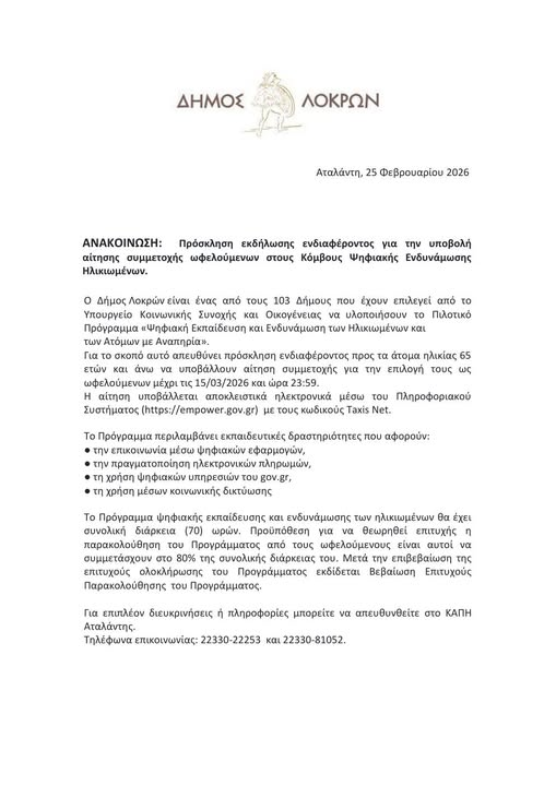 𝔰𝔱𝔢𝔯𝔢𝔞 Πρόσκληση ενδιαφέροντος admin 26 Φεβρουαρίου, 2026 Tags: Δήμος Λοκρών Post navigation Previous 🌿⚽ Καθαρίζουμε την πόλη μας, ΜΑΖΙ!Next Ο Δήμος Λοκρών στον ΔΕΗ Tour of Hellas 2026 Αφήστε μια απάντηση Ακύρωση απάντησηςΗ ηλ. διεύθυνση σας δεν δημοσιεύεται. Τα υποχρεωτικά πεδία σημειώνονται με *Σχόλιο * Όνομα * Email * Ιστότοπος Αποθήκευσε το όνομά μου, email, και τον ιστότοπο μου σε αυτόν τον πλοηγό για την επόμενη φορά που θα σχολιάσω. Related Stories 👉Δράση ενημέρωσης στην Άμφισσα για τη στρατιωτική σταδιοδρομία 𝔰𝔱𝔢𝔯𝔢𝔞 👉Δράση ενημέρωσης στην Άμφισσα για τη στρατιωτική σταδιοδρομία 26 Φεβρουαρίου, 2026 👉Απολογισμός πεπραγμένων για το 2025 της Διεύθυνσης Περιβάλλοντος και Πρασίνου 𝔰𝔱𝔢𝔯𝔢𝔞 👉Απολογισμός πεπραγμένων για το 2025 της Διεύθυνσης Περιβάλλοντος και Πρασίνου 26 Φεβρουαρίου, 2026 🔝 Το αδιαχώρητο επικράτησε και φέτος στον Δήμο Αμφίκλειας – Ελάτειας, με τις καρναβαλικές εκδηλώσεις 𝔰𝔱𝔢𝔯𝔢𝔞 🔝 Το αδιαχώρητο επικράτησε και φέτος στον Δήμο Αμφίκλειας – Ελάτειας, με τις καρναβαλικές εκδηλώσεις 26 Φεβρουαρίου, 2026