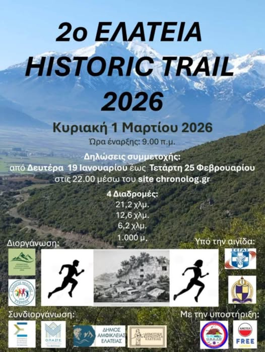 ➡️ Το 2ο “Ελάτεια Historic Trail”, το οποίο φιλοδοξεί να γίνει θεσμός προσελκύοντας κάθε χρόνο όλο και περισσότερους αθλητές, διοργανώνεται από τον Φυσιολατρικό, Ορειβατικό Σύλλογο Ελάτειας και τον Σύλλογο Νεολαίας Ελάτειας σε συνεργασία με την Περιφέρεια Στερεάς Ελλάδας, τον Δήμο Αμφίκλειας – Ελάτειας και τη Δημοτική Κοινότητα Ελάτειας και τελεί υπό την αιγίδα της ΕΑΣ ΣΕΓΑΣ Ανατολικής Στερεάς και του Αθλητικού Κολυμβητικού Ομίλου Λιβαδειάς.