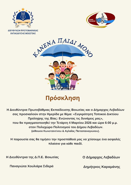 Η Διεύθυνση Πρωτοβάθμιας Εκπαίδευσης Βοιωτίας, αναγνωρίζοντας ότι η βία και ο εκφοβισμός αποτελούν σύνθετα κοινωνικά φαινόμενα που υπερβαίνουν τα όρια της σχολικής αίθουσας, ανακοινώνει την έναρξη μιας στρατηγικής συνεργασίας με τους έξι Δήμους του Νομού.