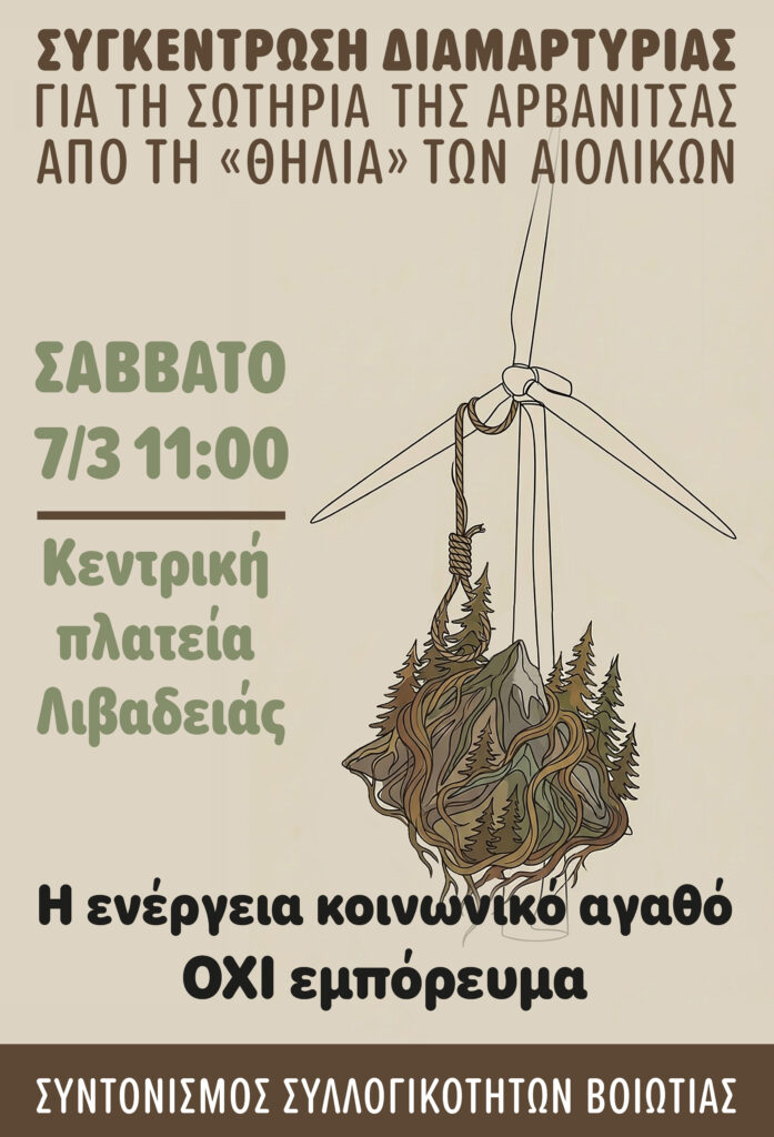 Στο πλαίσιο του συντονισμού φορέων, συλλογικοτήτων και πολιτών, ενάντια στην ενεργειακή “επέλαση” στη Βοιωτία, η οποία έχει οδηγήσει σε μια τεράστια υπερσυγκέντρωση ενεργειακών δραστηριοτήτων, θα πραγματοποιηθεί νέα κινητοποίηση το Σάββατο 7 Μαρτίου, ώρα 11:00, στη Λιβαδειά.