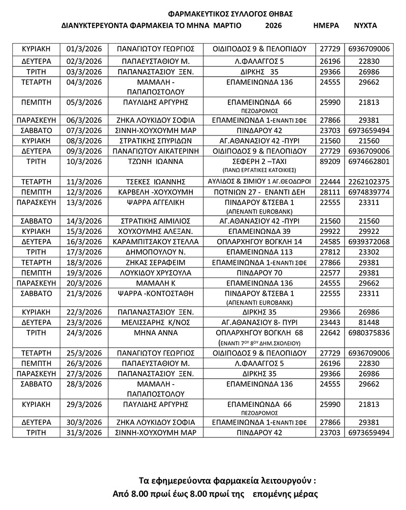 Θ͟͞ή͟͞β͟͞α͟͞ Φαρμακευτικός Σύλλογος Θήβας:Εφημερίες Μάρτιος 2026 admin 3 Μαρτίου, 2026 Tags: Εφημερίες Εφημερίες Μάρτιος 2026 ΘΗΒΑ Φαρμακεία Θήβας Post navigation Previous #ΟsloganNext Οι 4 μέρες γιορτής στην πόλη μας ολοκληρώθηκαν στις 28/2/20206 Αφήστε μια απάντηση Ακύρωση απάντησηςΗ ηλ. διεύθυνση σας δεν δημοσιεύεται. Τα υποχρεωτικά πεδία σημειώνονται με *Σχόλιο * Όνομα * Email * Ιστότοπος Αποθήκευσε το όνομά μου, email, και τον ιστότοπο μου σε αυτόν τον πλοηγό για την επόμενη φορά που θα σχολιάσω. Related Stories Η νέα σειρά ιστορικών ντοκιμαντέρ της ΕΡΤ 3 ταξιδεύει στην Θήβα Θ͟͞ή͟͞β͟͞α͟͞ Ιστορίες Μνήμης Η νέα σειρά ιστορικών ντοκιμαντέρ της ΕΡΤ 3 ταξιδεύει στην Θήβα 16 Απριλίου, 2026 Διακοπή ρεύματος στη Θήβα & σε χωριά Θ͟͞ή͟͞β͟͞α͟͞ Διακοπή ρεύματος στη Θήβα & σε χωριά 15 Απριλίου, 2026 Σύγκληση ΤΕΣΟΠ στο Γραφείο Δημάρχου του Δήμου Θηβαίων Θ͟͞ή͟͞β͟͞α͟͞ Σύγκληση ΤΕΣΟΠ στο Γραφείο Δημάρχου του Δήμου Θηβαίων 15 Απριλίου, 2026