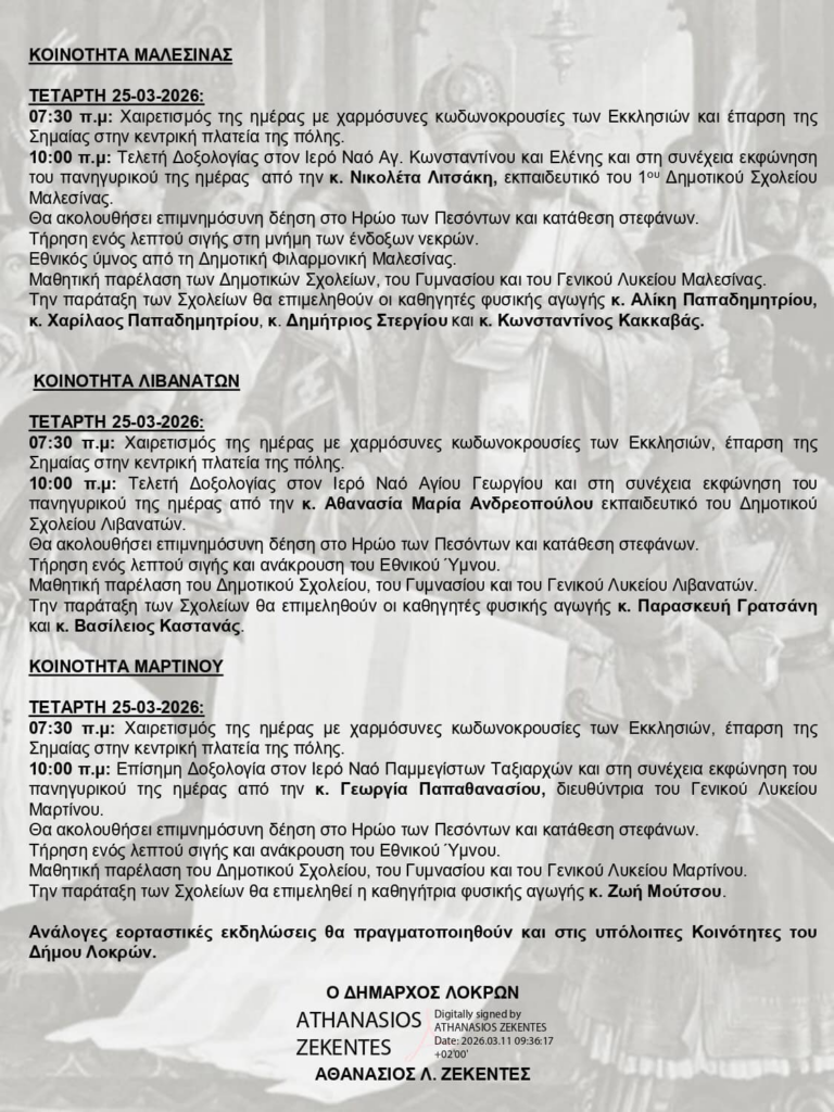 𝔰𝔱𝔢𝔯𝔢𝔞 Δήμος Λοκρών:Εορτασμός της 25ης Μαρτίου 1821 admin 12 Μαρτίου, 2026 Tags: 25 Μαρτίου 1821 Δήμος Λοκρών Post navigation Previous Παρουσίαση βιβλίου στην ΑταλάντηNext Ανάδειξη αντιπροσώπων ΠΑΣΟΚ Θήβας Αφήστε μια απάντηση Ακύρωση απάντησηςΗ ηλ. διεύθυνση σας δεν δημοσιεύεται. Τα υποχρεωτικά πεδία σημειώνονται με *Σχόλιο * Όνομα * Email * Ιστότοπος Αποθήκευσε το όνομά μου, email, και τον ιστότοπο μου σε αυτόν τον πλοηγό για την επόμενη φορά που θα σχολιάσω. Related Stories Δήμος Λοκρών:Ενημέρωση 𝔰𝔱𝔢𝔯𝔢𝔞 Δήμος Λοκρών:Ενημέρωση 15 Απριλίου, 2026 👉Υποβολή πρότασης του Δήμου Δελφών σε πρόγραμμα για την ανάδειξη των σπηλαιολογικών οικοσυστημάτων 𝔰𝔱𝔢𝔯𝔢𝔞 👉Υποβολή πρότασης του Δήμου Δελφών σε πρόγραμμα για την ανάδειξη των σπηλαιολογικών οικοσυστημάτων 15 Απριλίου, 2026 ➡Με το Ιστορικό δρώμενο, σήμερα η έναρξη των εκδηλώσεων της 205ης Επετείου της Απελευθέρωσης του Κάστρου των Σαλώνων 𝔰𝔱𝔢𝔯𝔢𝔞 ➡Με το Ιστορικό δρώμενο, σήμερα η έναρξη των εκδηλώσεων της 205ης Επετείου της Απελευθέρωσης του Κάστρου των Σαλώνων 15 Απριλίου, 2026
