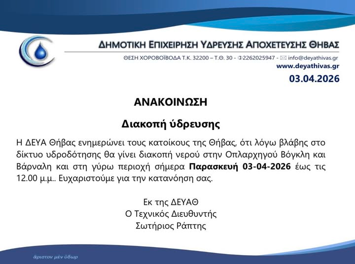 Θ͟͞ή͟͞β͟͞α͟͞ ΔΕΥΑΘ:Διακοπή υδροδότησης admin 3 Απριλίου, 2026 Tags: ΔΕΥΑΘ Post navigation Previous Λιβαδειά: Κινητοποίηση για να μην πληρώσουν οι εργαζόμενοι και ο λαός τις συνέπειες του πολέμουNext Ολοκληρώθηκε ο κύκλος προβολής ταινιών χειμερινού Κινηματογράφου,στο Συνεδριακό Κέντρο Θήβας Αφήστε μια απάντηση Ακύρωση απάντησηςΗ ηλ. διεύθυνση σας δεν δημοσιεύεται. Τα υποχρεωτικά πεδία σημειώνονται με *Σχόλιο * Όνομα * Email * Ιστότοπος Αποθήκευσε το όνομά μου, email, και τον ιστότοπο μου σε αυτόν τον πλοηγό για την επόμενη φορά που θα σχολιάσω. Related Stories Διακοπή ρεύματος στη Θήβα & σε χωριά Θ͟͞ή͟͞β͟͞α͟͞ Διακοπή ρεύματος στη Θήβα & σε χωριά 15 Απριλίου, 2026 Σύγκληση ΤΕΣΟΠ στο Γραφείο Δημάρχου του Δήμου Θηβαίων Θ͟͞ή͟͞β͟͞α͟͞ Σύγκληση ΤΕΣΟΠ στο Γραφείο Δημάρχου του Δήμου Θηβαίων 15 Απριλίου, 2026 📢📣 Κυκλοφοριακές ρυθμίσεις για την εκτέλεση εργασιών του έργου «Αποκαταστάσεις ζημιών από φυσικές καταστροφές» Θ͟͞ή͟͞β͟͞α͟͞ 📢📣 Κυκλοφοριακές ρυθμίσεις για την εκτέλεση εργασιών του έργου «Αποκαταστάσεις ζημιών από φυσικές καταστροφές» 15 Απριλίου, 2026