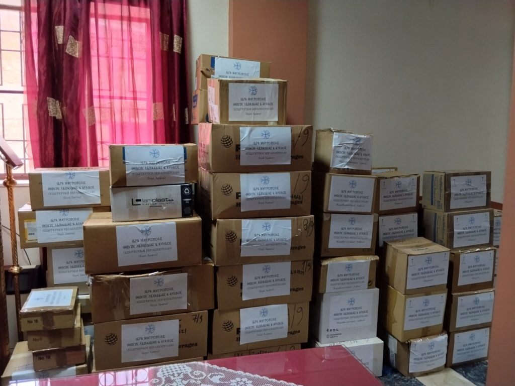 Η Τοπική μας Εκκλησία, κατόπιν παρακλήσεως του Σεβασμιωτάτου Μητροπολίτη Γουινέας κ. Γεωργίου, εκπροσώπου της Α.Θ.Μ. του Πατριάρχου Αλεξανδρείας κ. Θεοδώρου και Διευθυντή του Γραφείου του Πατριαρχείου στην Αθήνα, συγκέντρωσε και απέστειλε διάφορα είδη λειτουργικής χρήσης για την ενίσχυση των νεοϊδρυθεισών Επισκοπών και Ενοριών του Πατριαρχείου Αλεξανδρείας. Συγκεκριμένα, από τις Ενορίες και τις Μονές συγκεντρώθηκαν ποσότητες λαδιού, νάματος, θυμιάματος, καρβουνακίων, ιερατικών αμφίων και σκευών, καλυμμάτων Αγίας Τραπέζης κ.ά., ως μια μικρή ενίσχυση στην ευλογημένη προσπάθεια του Παλαιφάτου Πατριαρχείου Αλεξανδρείας και πάσης Αφρικής, που καταβάλλει τα μέγιστα διαθέτοντας πενιχρά μέσα για τον επανευαγγελισμό των αδελφών μας στην αφρικανική ήπειρο.