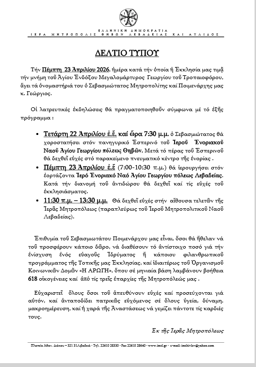 Β͇ο͇ι͇ω͇τ͇ί͇α͇ Πρόγραμμα ονομαστηρίων Σεβασμιωτάτου Μητροπολίτου Θηβών, Λεβαδείας και Αυλίδος κ. Γεωργίου admin 16 Απριλίου, 2026 Tags: IM Θηβών Λεβαδείας κ Αυλίδος Μητροπολίτης Θηβών Post navigation Previous Εορτή Ψηλαφήσεως Αποστόλου ΘωμάNext Συνελήφθη ημεδαπός στη Λαμία, σε βάρος του οποίου εκκρεμούσε καταδικαστική Απόφαση για διακεκριμένη κλοπή κατά συναυτουργία και κατ’ εξακολούθηση Αφήστε μια απάντηση Ακύρωση απάντησηςΗ ηλ. διεύθυνση σας δεν δημοσιεύεται. Τα υποχρεωτικά πεδία σημειώνονται με *Σχόλιο * Όνομα * Email * Ιστότοπος Αποθήκευσε το όνομά μου, email, και τον ιστότοπο μου σε αυτόν τον πλοηγό για την επόμενη φορά που θα σχολιάσω. Related Stories ΚΚΕ:Παρέμβαση στην ΕΕ για την Κωπαΐδα Β͇ο͇ι͇ω͇τ͇ί͇α͇ ΚΚΕ:Παρέμβαση στην ΕΕ για την Κωπαΐδα 18 Απριλίου, 2026 Εορτή Ζωοδόχου Πηγής Β͇ο͇ι͇ω͇τ͇ί͇α͇ Εορτή Ζωοδόχου Πηγής 18 Απριλίου, 2026 Συνάντηση στελεχών κατασκήνωσης Β͇ο͇ι͇ω͇τ͇ί͇α͇ Συνάντηση στελεχών κατασκήνωσης 17 Απριλίου, 2026