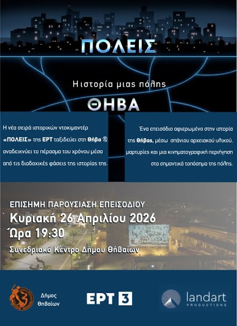Η εκδήλωση προβολής θα πραγματοποιηθεί την Κυριακή 26 Απριλίου 2026, στις 7:30 μ.μ., στο Συνεδριακό Κέντρο Δήμου Θηβαίων