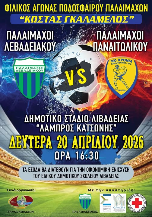 ⚽️Ο Δήμος Λεβαδέων στηρίζει τον φιλικό αγώνα παλαιμάχων «Κώστας Γκαλαμέλος», ανάμεσα στους παλαίμαχους Λεβαδειακού και Παναιτωλικού, που θα διεξαχθεί τη Δευτέρα 20 Απριλίου στο Δημοτικό Στάδιο Λιβαδειάς «Λάμπρος Κατσώνης».