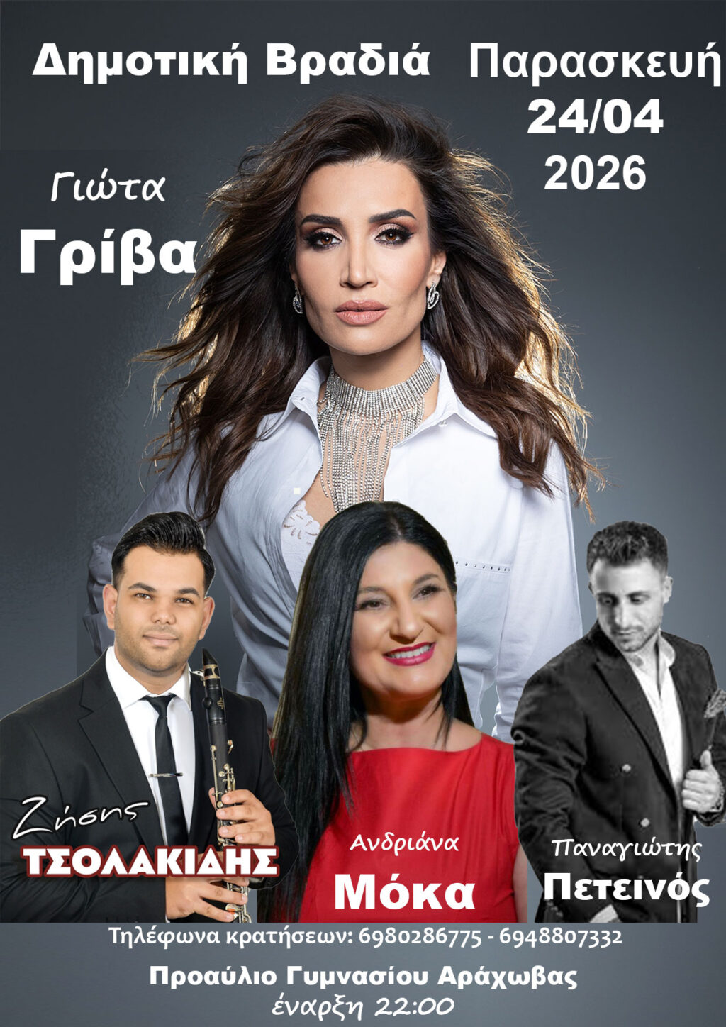 Στο πλαίσιο των εορταστικών εκδηλώσεων για το «Πανηγυράκι» του Αγίου Γεωργίου, σας προσκαλούμε σε μια αυθεντική δημοτική βραδιά την Παρασκευή 24 Απριλίου στην Αράχωβα.