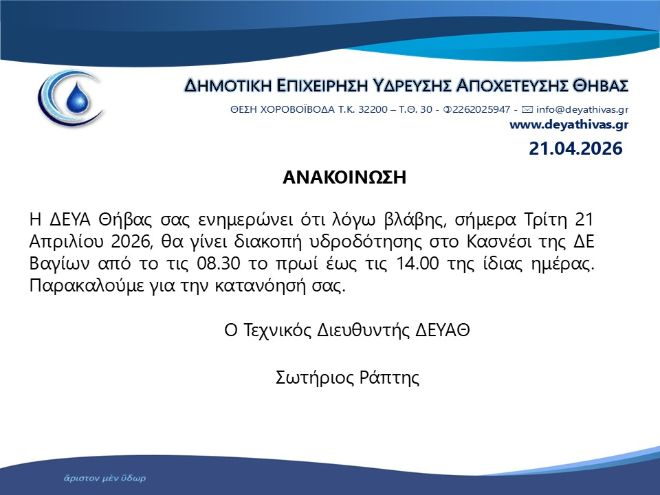 Θ͟͞ή͟͞β͟͞α͟͞ Διακοπή υδροδότησης admin 21 Απριλίου, 2026 Tags: ΔΕΥΑΘ ΘΗΒΑ Post navigation Previous Πρόγραμμα πανηγύρεως Ιεράς Μονής Αγίου Γεωργίου ΜαυρομματίουNext Συγχαρητήρια Επιστολή Δημάρχου Θηβαίων στον ΑΟ Θήβας για την κατάκτηση Πρωταθλήματος Α’Κατηγορίας Αφήστε μια απάντηση Ακύρωση απάντησηςΗ ηλ. διεύθυνση σας δεν δημοσιεύεται. Τα υποχρεωτικά πεδία σημειώνονται με *Σχόλιο * Όνομα * Email * Ιστότοπος Αποθήκευσε το όνομά μου, email, και τον ιστότοπο μου σε αυτόν τον πλοηγό για την επόμενη φορά που θα σχολιάσω. Related Stories Πρόγραμμα Εορτής Πολιούχου Θηβών Αγίου Ιωάννου του Καλοκτένους Θ͟͞ή͟͞β͟͞α͟͞ Πρόγραμμα Εορτής Πολιούχου Θηβών Αγίου Ιωάννου του Καλοκτένους 20 Απριλίου, 2026 Στάικος για την ανεξαρτητοποίηση Αγγελίνα Θ͟͞ή͟͞β͟͞α͟͞ Στάικος για την ανεξαρτητοποίηση Αγγελίνα 19 Απριλίου, 2026 ΘΗΒΑ:« Η ξεχασμένη πόλη της Αρχαίας Ελλάδας» Ε͟κ͟δ͟η͟λ͟ώ͟σ͟ε͟ι͟ς͟ Θ͟͞ή͟͞β͟͞α͟͞ ΘΗΒΑ:« Η ξεχασμένη πόλη της Αρχαίας Ελλάδας» 17 Απριλίου, 2026