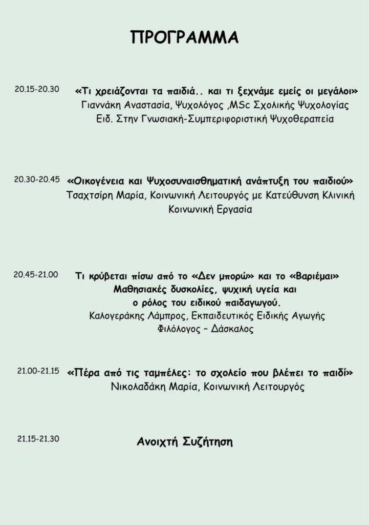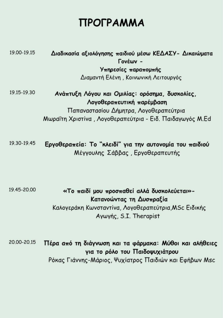Η παρουσία και η πολύτιμη συμβολή σας ανέδειξαν τη σημασία της πρόληψης, της ενημέρωσης και της έγκαιρης παρέμβασης στην ψυχική υγεία των παιδιών. Μέσα από τις εισηγήσεις και τις γνώσεις που μοιραστήκατε, προσφέρατε ουσιαστική στήριξη και καθοδήγηση στους γονείς, ενισχύοντας τον ρόλο τους και βοηθώντας τους να κατανοήσουν καλύτερα τις ανάγκες των παιδιών τους.