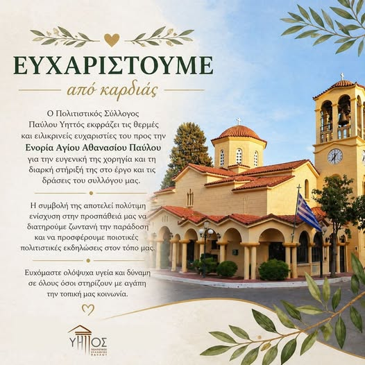 Ο Πολιτιστικός Σύλλογος Παύλου Υηττός εκφράζει τις θερμές και ειλικρινείς ευχαριστίες του προς την Ενορία Αγίου Αθανασίου Παύλου για την ευγενική της χορηγία και τη διαρκή στήριξή της στο έργο και τις δράσεις του συλλόγου μας.