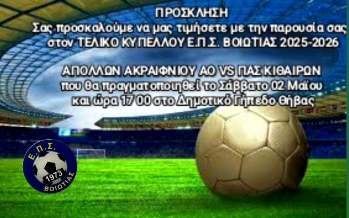 Ο Πρόεδρος και η Επιτροπή Πρωταθλημάτων και Κυπέλλου της Ε.Π.Σ. Βοιωτίας σας προσκαλούν στον ΤΕΛΙΚΌ ΚΥΠΈΛΛΟΥ Ε.Π.Σ.ΒΟΙΩΤΙΑΣ 2025-2026 μεταξύ των ομάδων