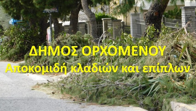 Ο Δήμος Ορχομενού ανακοινώνει στους δημότες ότι για την αποκομιδή κομμένων κλαδιών και επίπλων θα πρέπει να ενημερώνουν την αρμόδια υπηρεσία τουλάχιστον 2-3 ημέρες νωρίτερα ώστε να γίνεται ο κατάλληλος προγραμματισμός. Η αποκομιδή γίνεται μόνο εκτός των οικοπέδων ενώ λόγω του μεγάλου φόρτου εργασίας θα τηρείται, αυστηρά, σειρά προτεραιότητας.